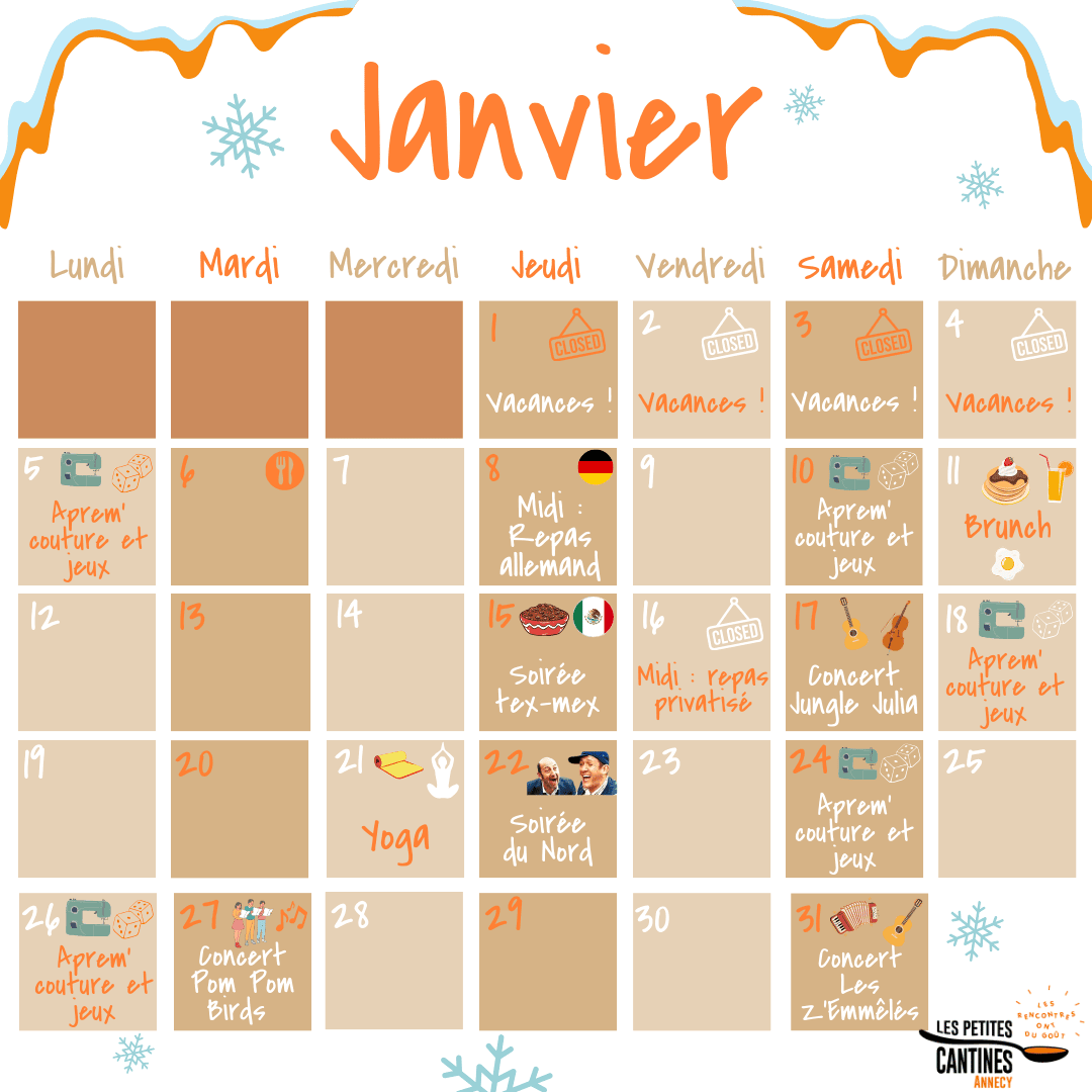 🧡 à 12h15 pour le repasDes repas thématiques, concerts ou autres animations sont aussi proposés certains soirs et week-ends, consultez le calendrier ci-dessous pour plus d'infos.