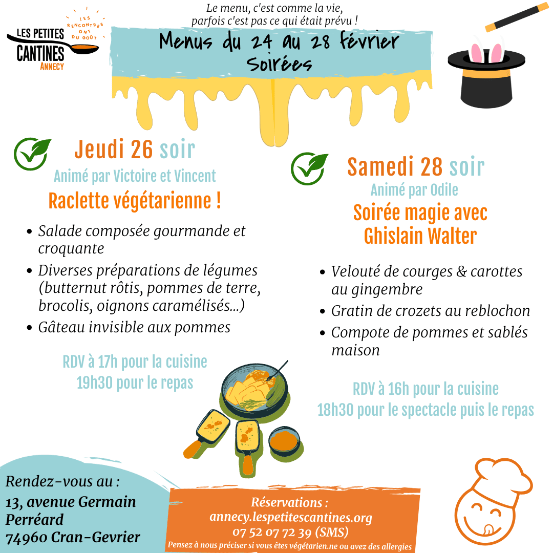 Plus d'infos sur ces événements en-dessous de notre module de réservation, rubrique "Les prochains rendez-vous de la cantine" !